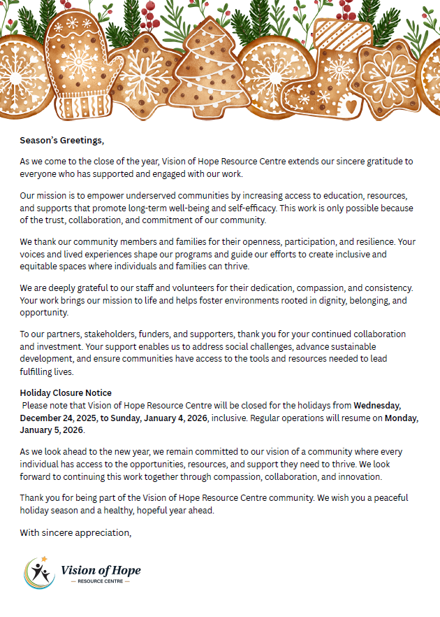 Vision of Hope Resource Centre (VOHRC) is a Black-led, Black-serving, and Black-mandated (B3) organization rooted in equity, compassion, and community empowerment. Our mission is to uplift underserved communities by providing access to education, resources, and holistic support that foster long-term well-being and self-efficacy. We are committed to building an inclusive and equitable society where individuals and families thrive. Through collaboration, advocacy, and innovative programming, VOHRC addresses pressing social challenges, promotes sustainable development, and ensures that every person has the tools and opportunities to lead a fulfilling life.