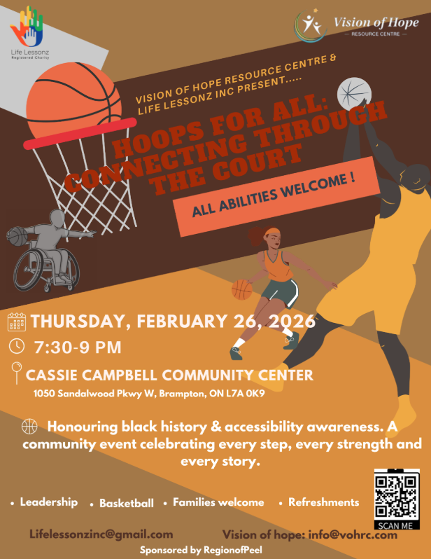 We are also proud to partner with Life Lessonz Inc to host a community celebration in honour of Black History Month. Funded by the Region of Peel, Hoops for All: Connecting Through the Court is a basketball-based event that celebrates Black history, uplifts youth, and centres accessibility awareness.